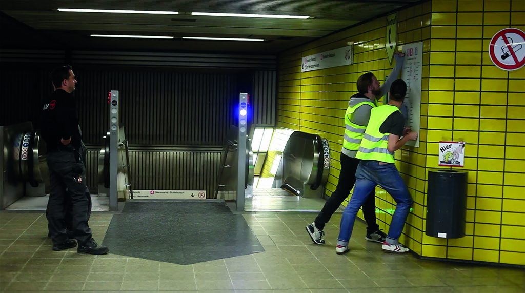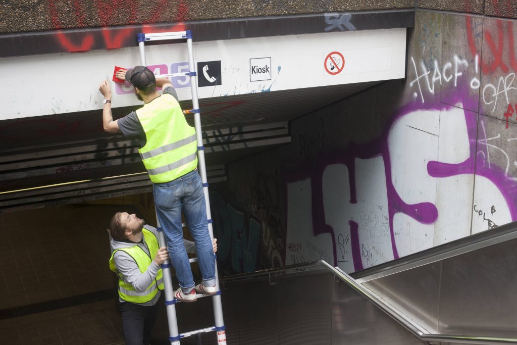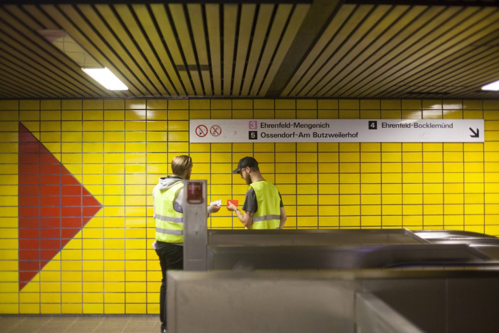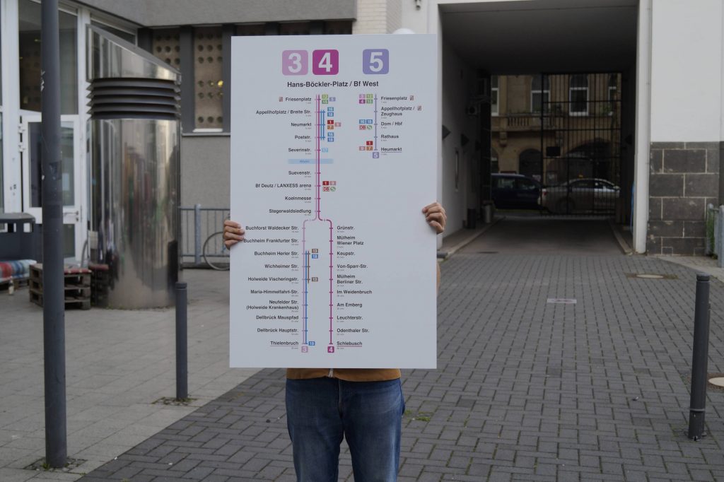 Darüber hinaus wurden Beschilderungssysteme für die Haltestellen entwickelt, die der Problematik entgegenwirken sollten, dass sich ein Großteil der KVB-Kunden in der Stadt verfährt. Diese listen die angefahrenen Haltestellen sowie Umsteigemöglichkeiten und Fahrzeiten auf, um den Fahrgästen einen Überblick über ihre Reise zu verschaffen. Als Pilotprojekt wurden diese Schilder für die Haltestelle „Hans Böckler Platz / Bahnhof West“ auf Alu-Dibond Platten produziert und in eine Guerilla Aktion dort angebracht. Dort hingen sie fast einen Monat lang, bis die KVB sie schließlich entfernen ließ.